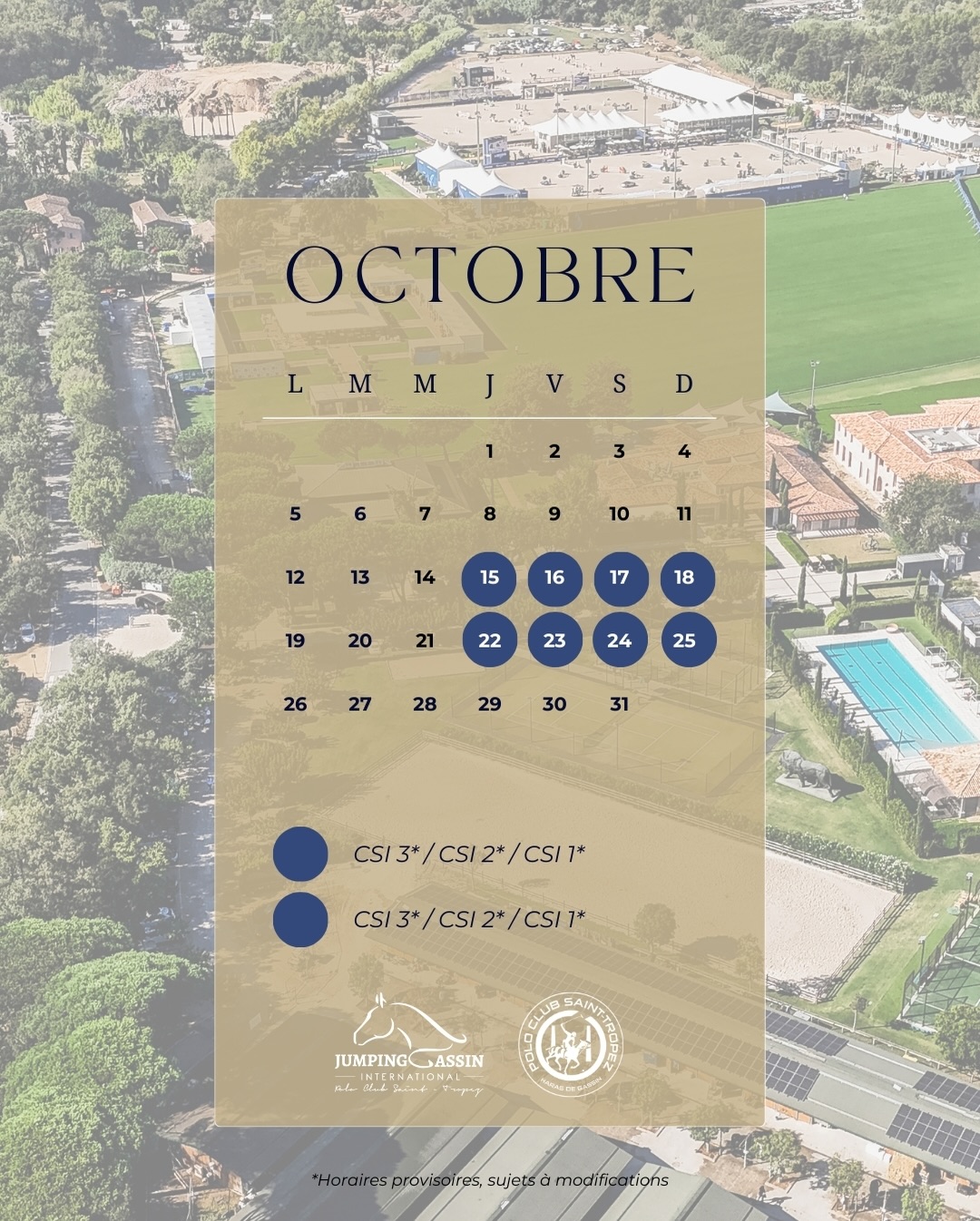 Pour clôturer la saison, du 15 au 18 et du 22 au 25 Octobre, retrouvez nos derniers CSI avec deux labels 3*. Un final ensoleillé en bord de mer, qui concentre toute l’énergie et le prestige de la saison.