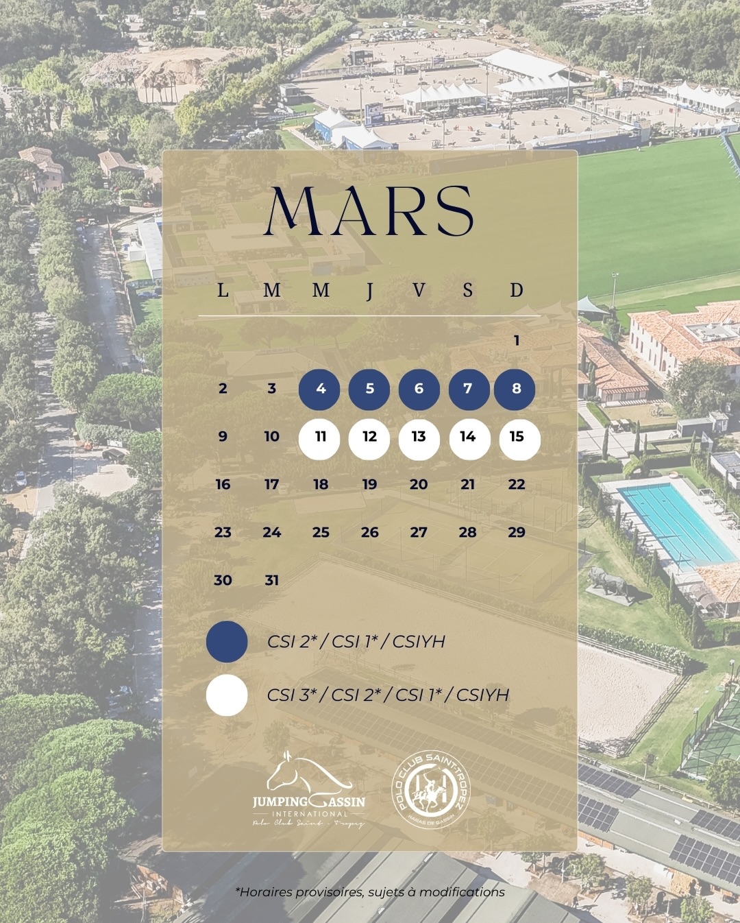 Découvrez les deux premières étapes de la saison à Gassin : les CSI du 11 au 15 et du 18 au 22 Février ouvrent la compétition avec les labels 2*, 1*, YH et Poney. Un départ idéal pour lancer la saison et prendre le rythme.
