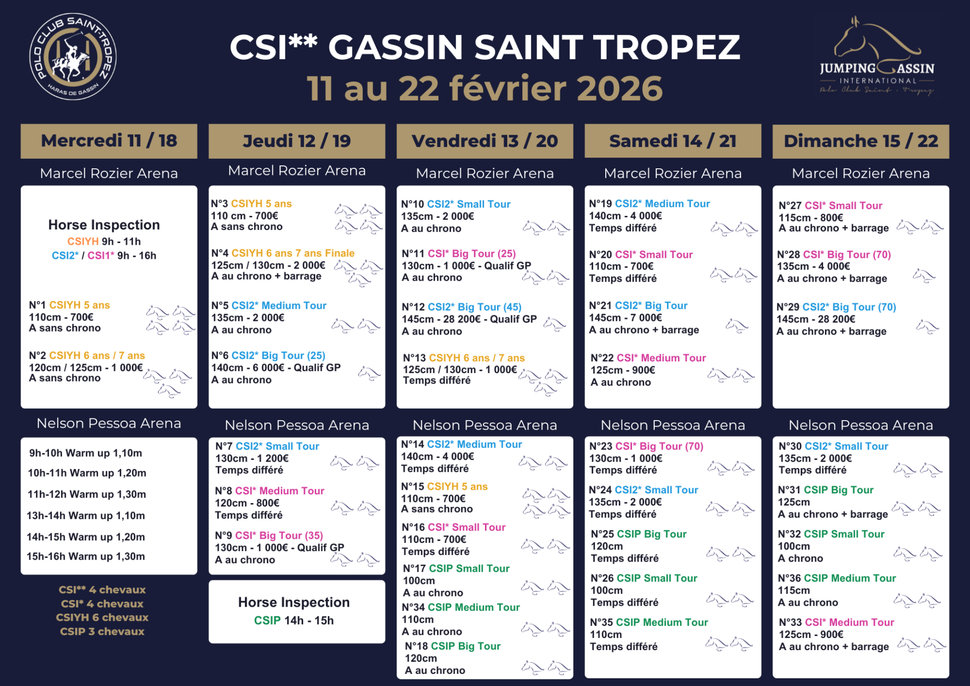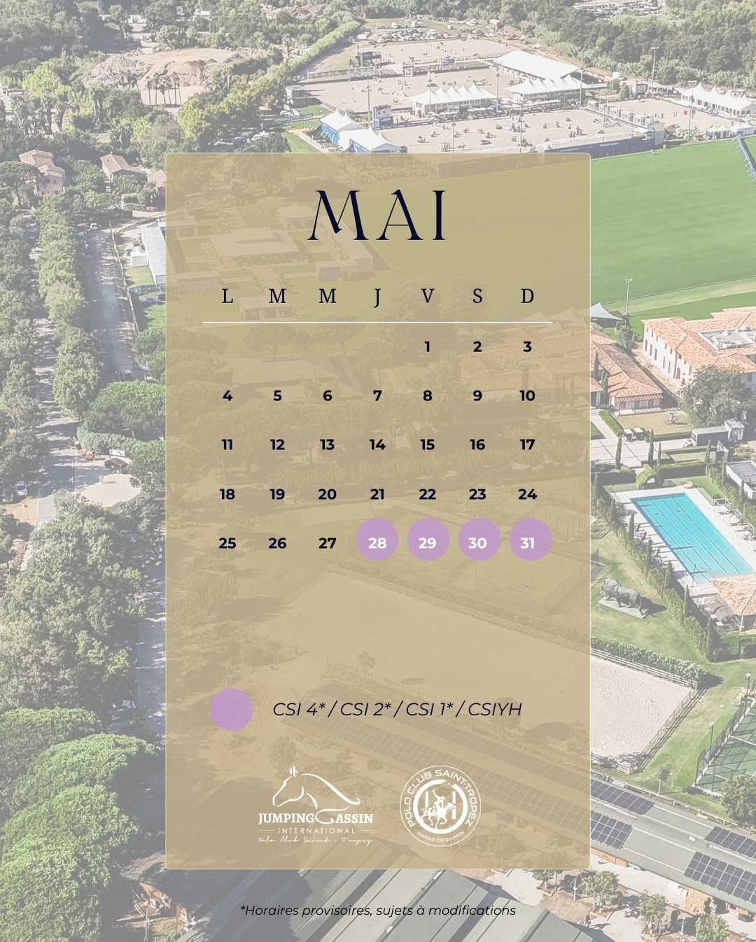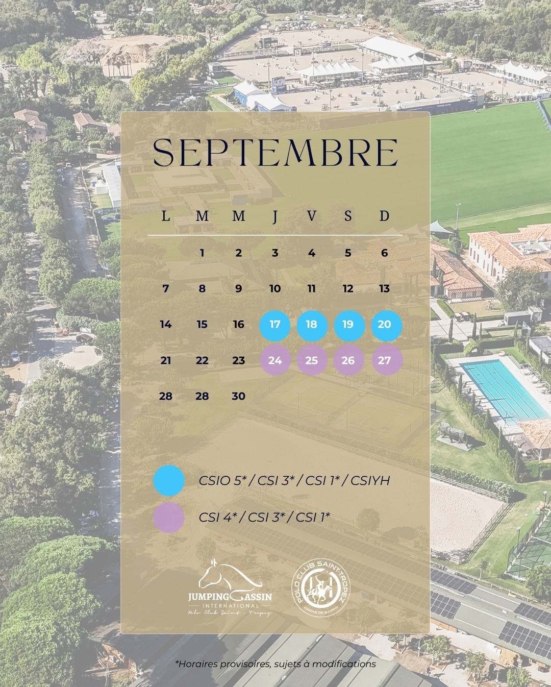 Horse Events vous invite à suivre 12 semaines de CSI au Polo Club Saint‑Tropez – Haras de Gassin, de février à octobre 2026. Découvrez ci‑dessous les étapes réparties tout au long de la saison.
